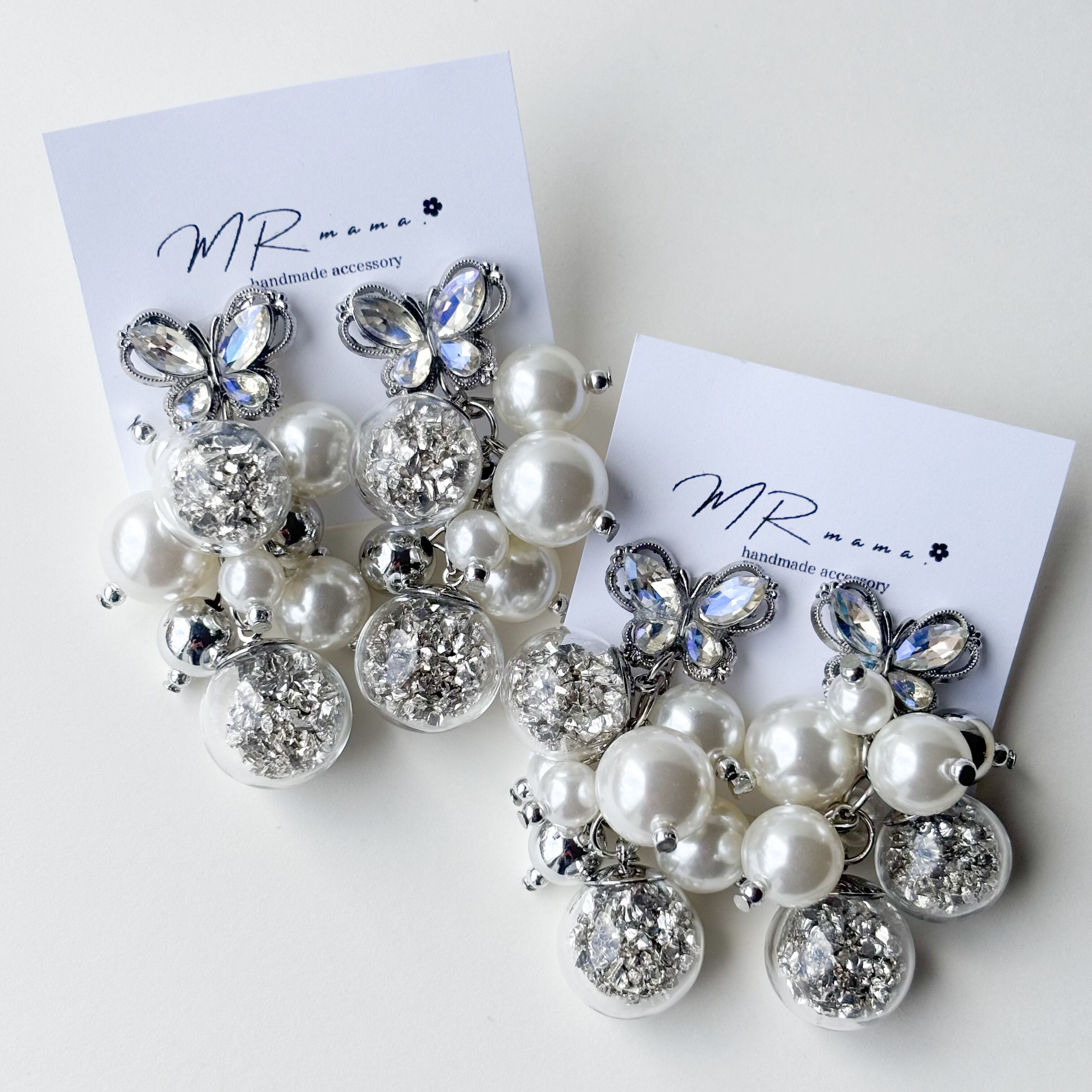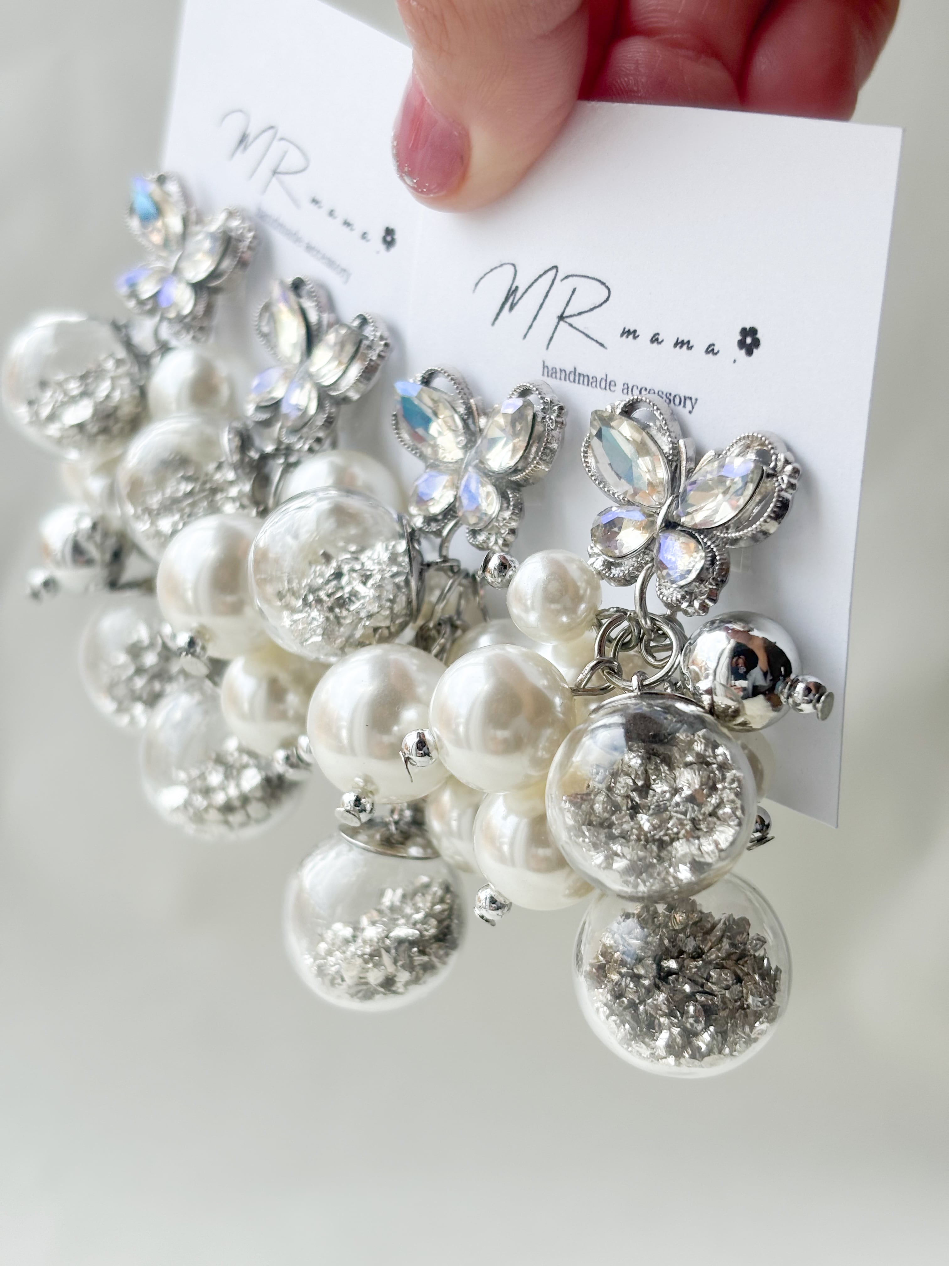 蝶ビジュー × パールとガラスドーム 大ぶり ピアス / イヤリング . アレルギー対応