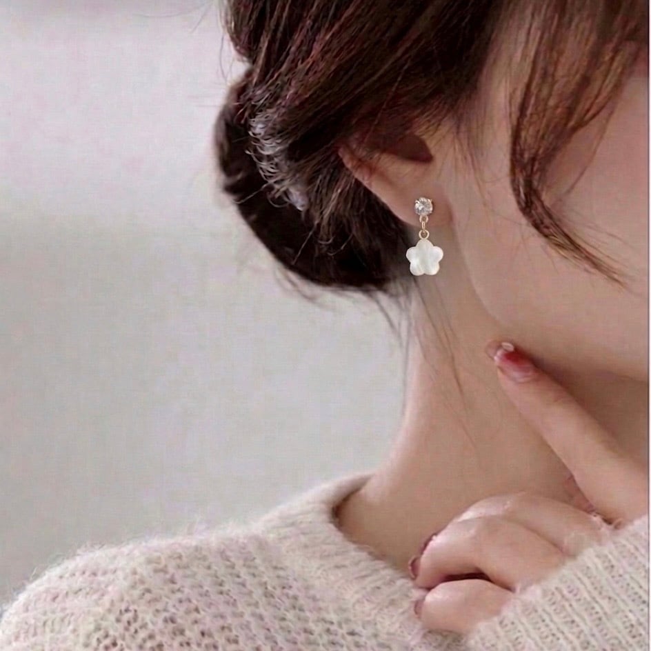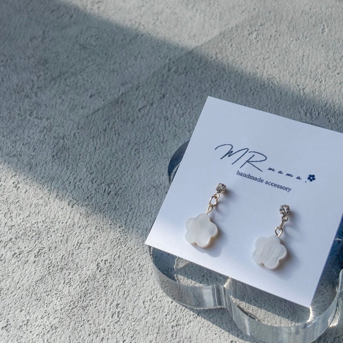 花 × ビジュー ホワイトシェル ピアス 白蝶貝 ビジュー キュービックジルコニア シェル チタンピアス フラワー 小ぶり シンプル 上品 ピアス / イヤリング / 樹脂ノンホールピアス . 卒業式 入学式