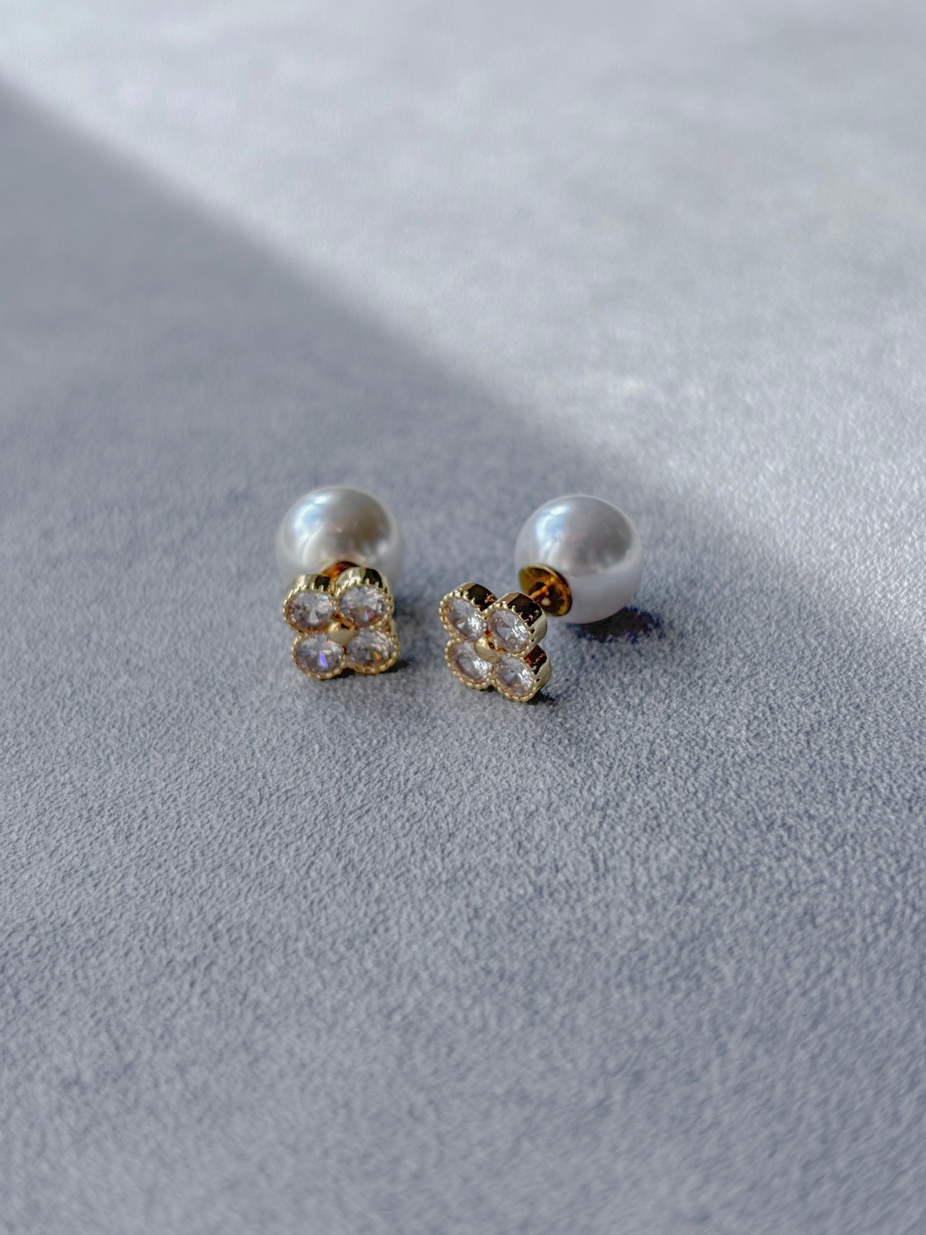 ビジュー クローバー キュービックジルコニア ピアス / イヤリング . シルバー925 パール ビジュー . 金属アレルギー対応 パールキャッチ ミニピアス 小ぶり