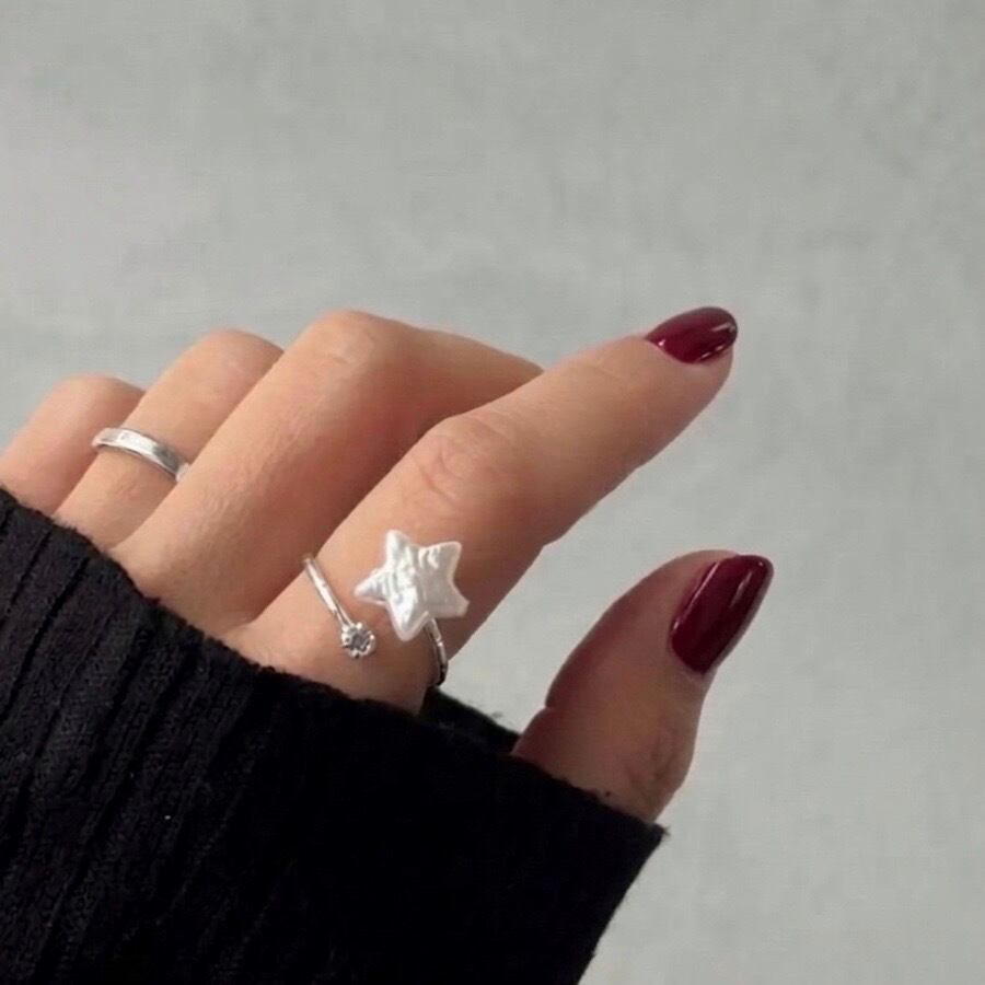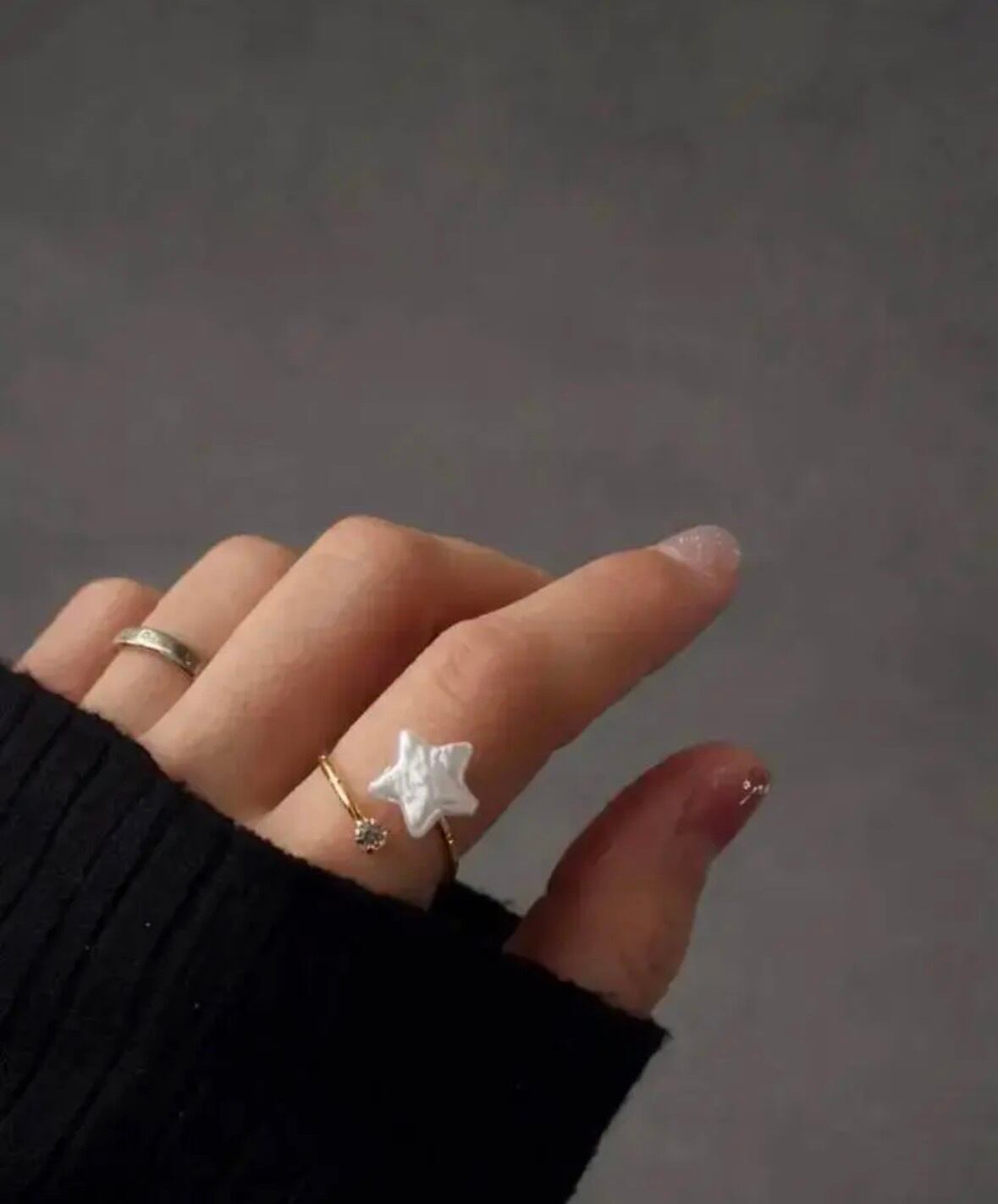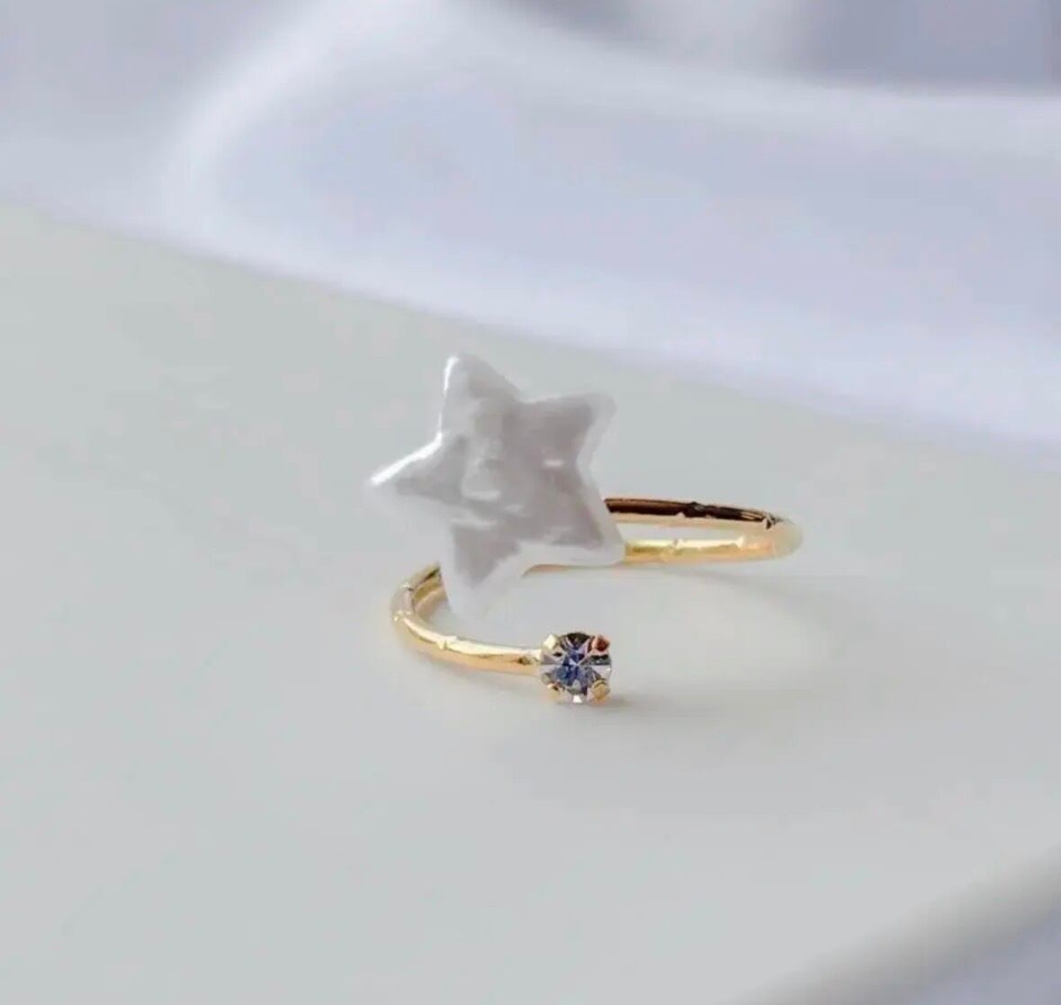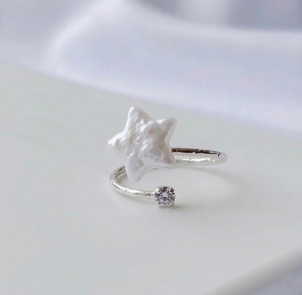 星パール ビジュー 指輪 . キュービックジルコニア パール 星 フォークリング 調節可能 フリーサイズ バロックパール ジルコニア ❮ シルバー ❯