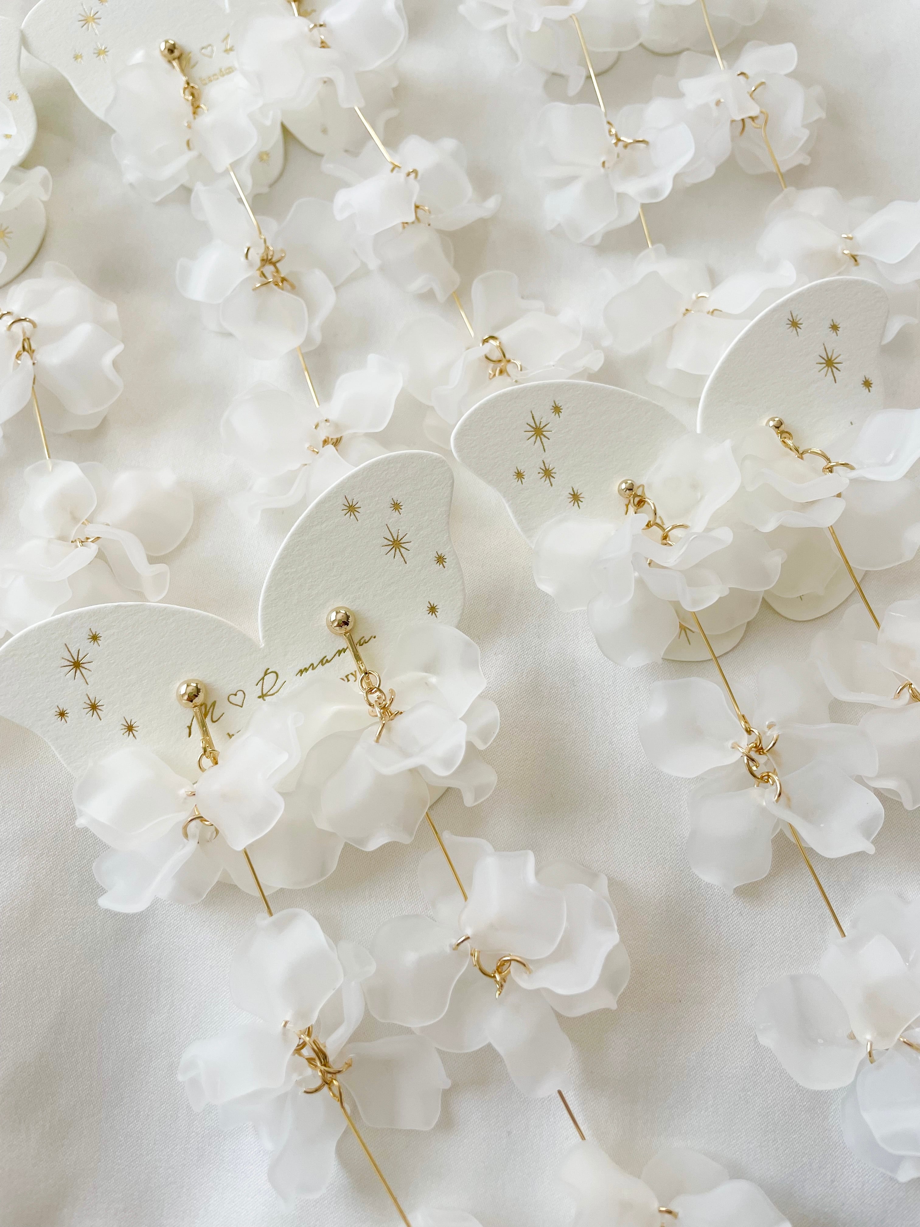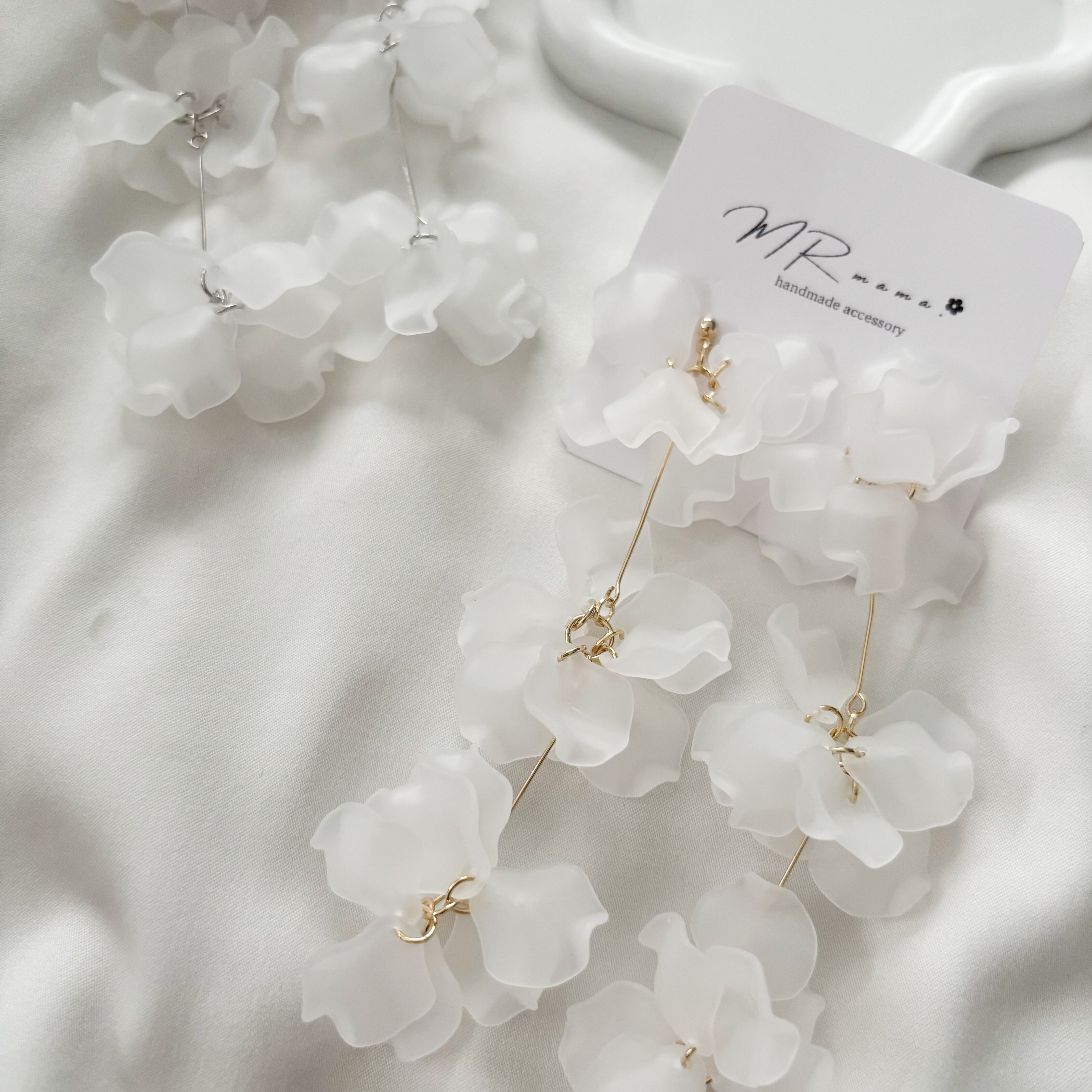 ホワイト アクリルフラワー 三連 ピアス / イヤリング ゴールド ブライダル ウェディング 揺れる